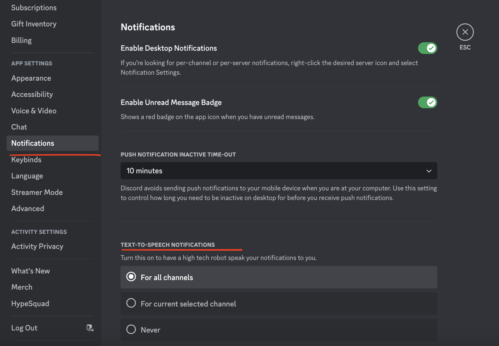 - Selecting from the options for TTS notifications: For all channels, only mentioned, or never.
