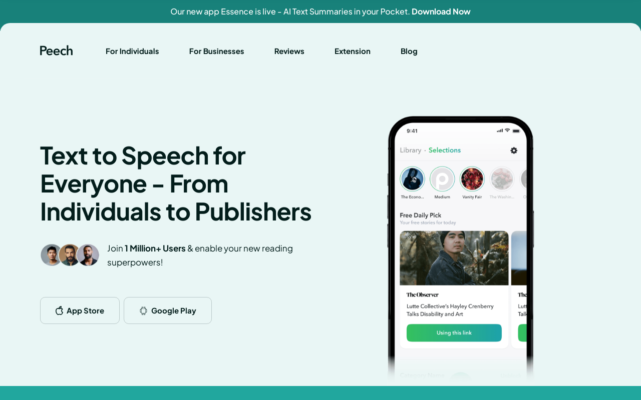 - Simple User Interface: Peech users can experience the benefits of seamless tool use, enjoying high-quality audio while listening.